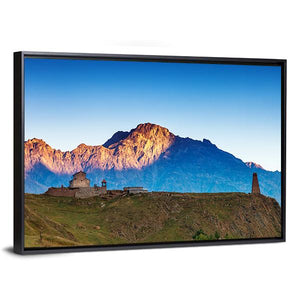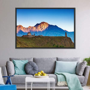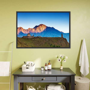 A realistic landscape of high mountains with a stone church and tower, bathed in morning sunlight. Cool blues and greens meet warm browns and yellow highlights to create a serene, majestic mood that fits living rooms and entryways.