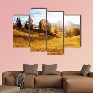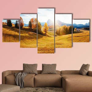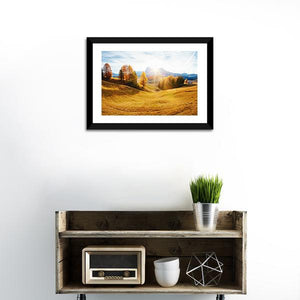 Autumn Hills In South Tyrol captures rolling hills and autumn trees lit by golden sunlight and sunbeams, with distant mountains and streaked clouds for depth. The realistic landscape feels peaceful, warm, and bright. It fits well in modern, nature-inspired interiors seeking a calm focal piece.