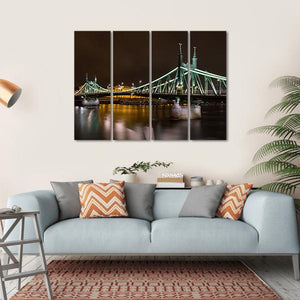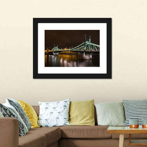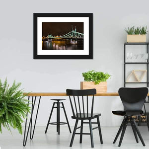 This captivating canvas art features the illuminated Liberty Bridge in Budapest, set against a serene night sky. The enchanting greens and soft reflections on the river create a calm atmosphere, making it a beautiful addition to any space.