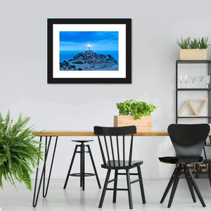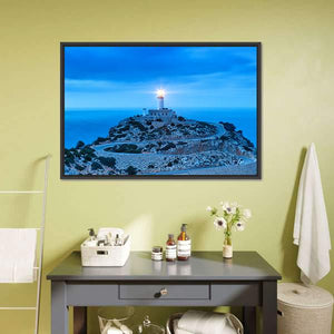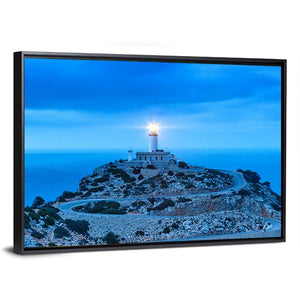 Formentor Lighthouse Canvas Art depicts a realistic lighthouse on coastal cliffs with a winding road and the ocean at twilight, the lighthouse light clearly illuminated. Cool blues, whites, grays, and greens create a serene, dramatic, and vast atmosphere. It suits coastal or modern room decor.