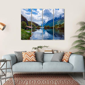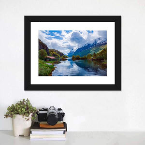 Capture the serene beauty of Lovatnet Lake in Norway with this stunning canvas art. Featuring a picturesque scene of a red-roofed cabin by the tranquil waters, snow-capped mountains rise majestically in the background, reflecting on the lake's surface.
