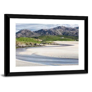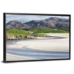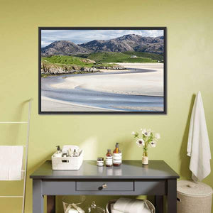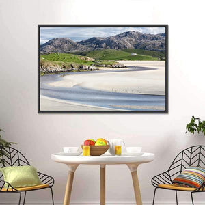 Low Tide At Uig Beach Canvas Wall Art shows a photorealistic beach landscape with distant mountains, a river channel, and a small white building on the horizon. Soft blues, greens, whites and grays create a serene, natural, and spacious mood. This scenic piece suits coastal or modern rooms as a quiet focal point.