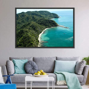 Ballena Bay Costa Rica Canvas Wall Art presents a photorealistic aerial view of a tropical coastline, where lush green hills meet clear turquoise water and a white sandy beach. The image reads serene and vibrant, using natural greens, blues, whites, and browns with a balanced rule-of-thirds composition. It works well in modern or coastal-inspired rooms as a nature-focused statement piece.
