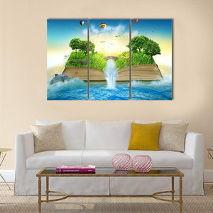 A whimsical, dreamlike fantasy scene unfolds from an open book: a waterfall pours from its pages, a dolphin leaps from the water, trees and a deer rest on the pages, and hot air balloons drift overhead. Rendered in blue, green, yellow and white with layered depth and a rule-of-thirds composition, this surreal canvas print suits modern interiors and reading nooks with a serene, imaginative mood.