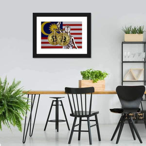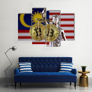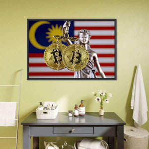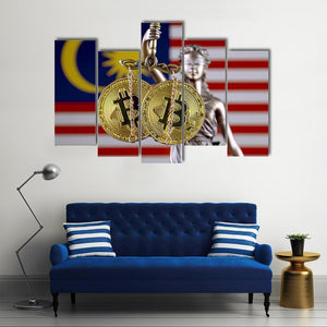 This modern canvas art features the Malaysian flag alongside a powerful representation of justice, symbolized by a statue holding Bitcoin coins. The serious tone and vibrant palette of gold, red, blue, and white make it a striking addition to any space.