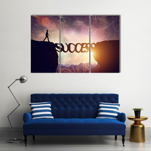 This typographic canvas shows the word "SUCCESS" spelled between cliffs, set against a sunset palette of gold, orange, purple and black. The modern, abstract composition uses depth, framing and perspective to create a grand, hopeful mood that reads as motivational and ambitious — a good fit for modern homes or motivational rooms.