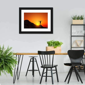 A silhouetted man stands with arms outstretched on a mountain as the sun sets behind him, creating an inspiring, triumphant scene. Warm orange and yellow tones and a dramatic photographic style give the image an adventurous, cinematic atmosphere. Works well as modern room decor for living rooms, bedrooms, or entryways.