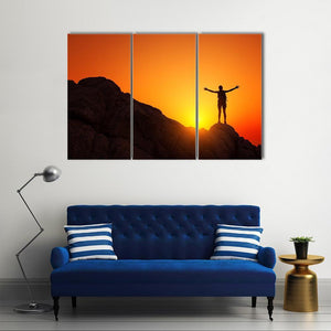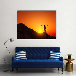 Man on Mountain Celebrating at Sunset Canvas Wall Art