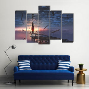 This canvas wall art beautifully depicts a man standing on an old bridge, gazing at the breathtaking sunset over the sea. The digital art style evokes a mix of emotions, making it a striking and powerful addition to any home decor. Bring the beauty of this artwork into your home and capture the attention of all who see it.