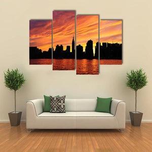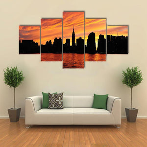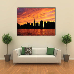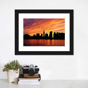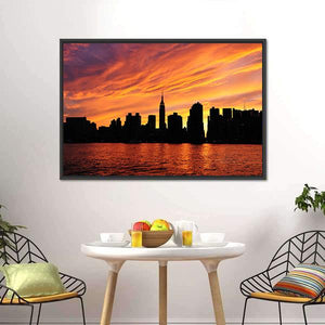This vibrant canvas art captures the dramatic silhouette of Manhattan's skyline at sunset, with the iconic Empire State Building prominently featured. Its rich palette of orange, purple, and black evokes a striking atmosphere, making it a captivating addition to your wall decor.