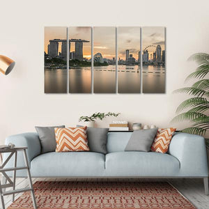 This serene canvas captures the iconic Marina Bay Sands and the Singapore Flyer against a calming backdrop of orange and blue. Featuring a horizontal panorama, it beautifully portrays the skyline's distinctive buildings and the waterfront's reflective waters.