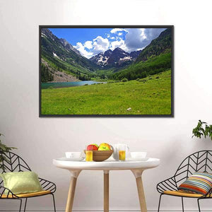 This canvas wall art captures the serene beauty of the Maroon Bells in Aspen, featuring snow-capped mountains, a tranquil mountain lake, and lush green hills under a bright blue sky. Perfect for bringing a touch of nature's majesty into your space.