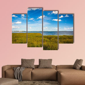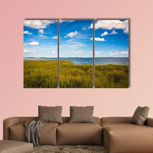 Marsh Grasses With Lake shows tall, golden marsh grass in the foreground with a blue ocean and gentle waves beneath a bright sky of fluffy white clouds. The realistic landscape creates a peaceful, natural mood. It fits coastal or modern interiors, such as living rooms and bedrooms.