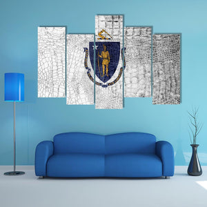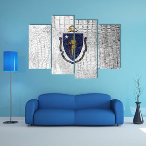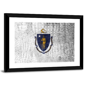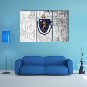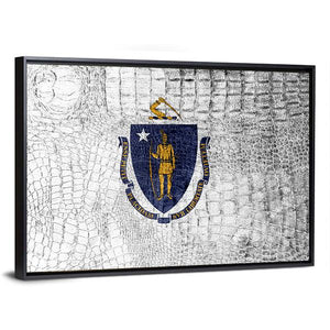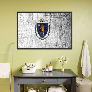 This canvas shows the Massachusetts state flag set against a textured, almost reptilian background for a bold, graphic feel. Its emblematic presence fits modern homes and patriotic rooms that favor strong, simple wall decor.