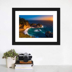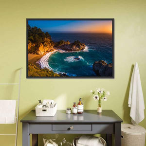 McWay Falls, California, seen from a high aerial perspective: a waterfall flowing into the ocean beside rugged cliffs, rock formations and trees. Photorealistic detail and dramatic lighting bring out blues, teals and warm oranges for a serene, majestic coastal mood. Suits beach- or nature-themed room decor in a modern house setting.