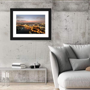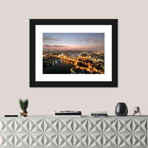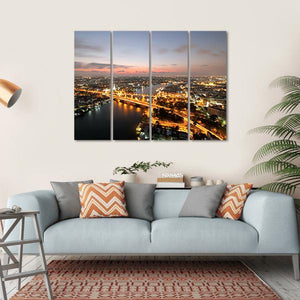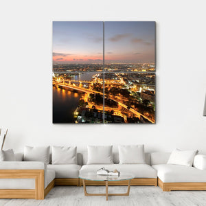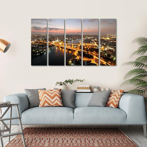 This canvas wall art captures the dynamic city skyline of Thailand, featuring a vibrant portrayal of the Memorial Bridge against a twilight sky. The energetic colors of blue, orange, and yellow evoke the lively atmosphere of an urban setting, perfect for adding a contemporary touch to your space.