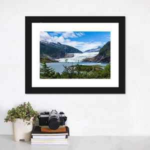 Immerse yourself in the serene beauty of the Mendenhall Glacier and its calm blue lake with this captivating canvas wall art. Featuring a majestic mix of icy glacier faces, forested slopes, and a cloudy sky, this piece brings the tranquility of nature into your space.