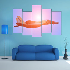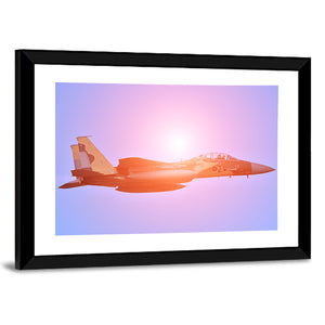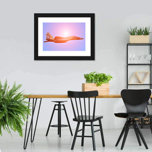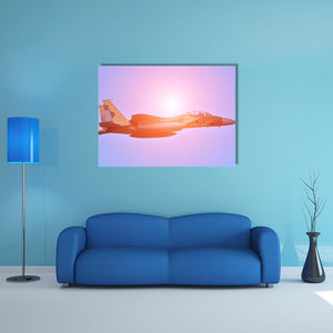 This canvas features a striking fighter jet in flight, set against a vibrant backdrop of pink, blue, and orange. The dynamic composition captures a powerful moment, highlighted by a bright sun flare, making it a dramatic addition to any space.