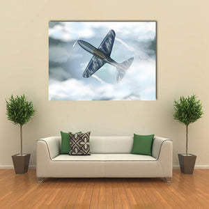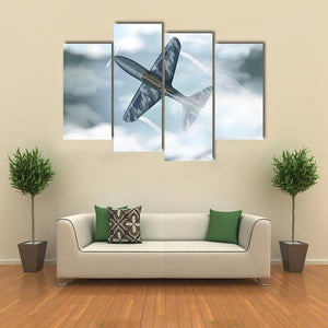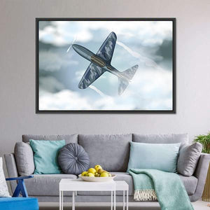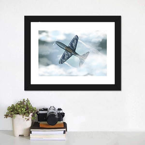A vintage-style illustration of a military jet in flight, set against blue and gray clouds with contrails and a spinning propeller that conveys motion. The diagonal, aerial composition gives a dramatic, adventurous feel and works well with modern or military-inspired home decor.