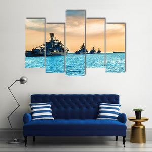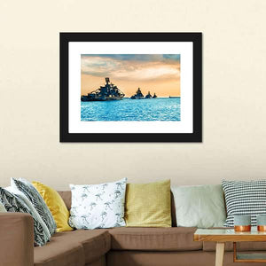 Experience the serene beauty of multiple navy ships sailing in calm waters beneath a sunset sky. This artwork captures the majestic blend of blue and orange hues, perfect for adding a peaceful touch to your home decor.
