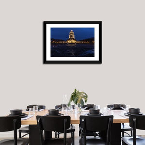 This canvas shows a realistic, symmetrical view of a military tower in Germany — a monument lit against a dark night sky with wet ground reflecting the lights. The blue, black, gray and brown palette and somber, historical mood suit modern or historical-themed rooms as a quiet, architectural focal point.