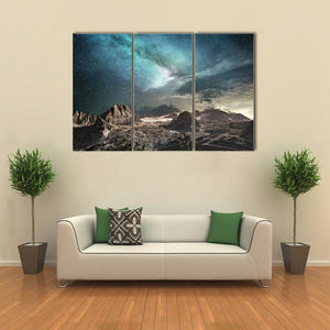 Milky Way At Dawn places snow-capped mountains beneath a galaxy-filled night sky, captured in a wide-angle landscape. The blue, green, grey and white palette creates a serene, vast, awe-inspiring mood that suits modern home décor and calm room settings.