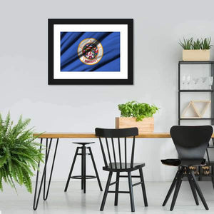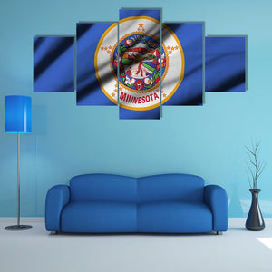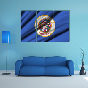This canvas depicts the Minnesota state flag with its central seal, a golden border, and the word MINNESOTA arched beneath the seal. Rendered in a realistic blue, gold, green and white palette with a subtle sense of motion, it conveys an official, historical, and proud presence suited to modern home or office walls.