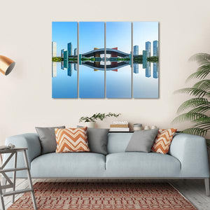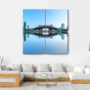 This canvas art captures a serene city skyline reflected in tranquil waters. The calming palette of blue and grey enhances the modern aesthetic, making it a perfect addition to any contemporary space.