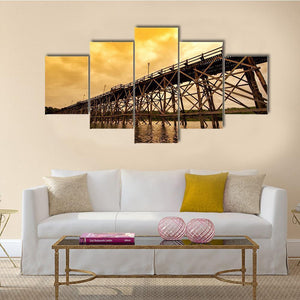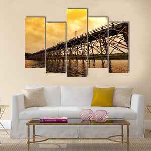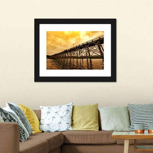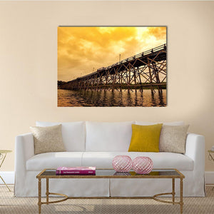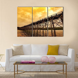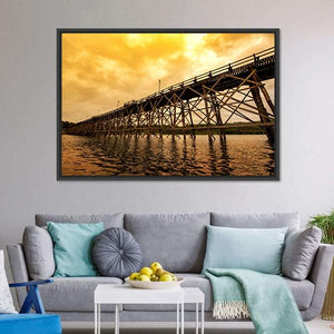Mon Bridge At Dawn depicts a wooden trestle bridge crossing a river beneath a cloudy, orange-tinged sky. The realistic scene uses diagonal lines and brown, grey, and orange tones to create a dramatic dawn mood. Works well in modern living rooms or entryways that favor place-focused wall art.
