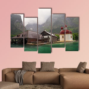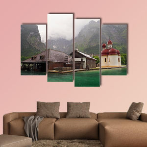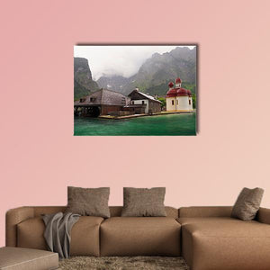 A photorealistic landscape of the Monastery of St. Bartholomew beside a quiet lake, with mountains rising behind, a red‑domed church and a wooden boathouse. The overcast, tranquil mood and muted greens, grays and browns create a calm, contemplative feel that suits modern, nature‑inspired rooms.