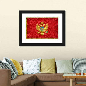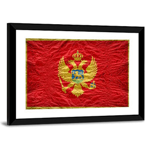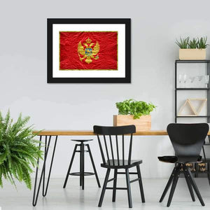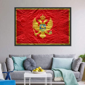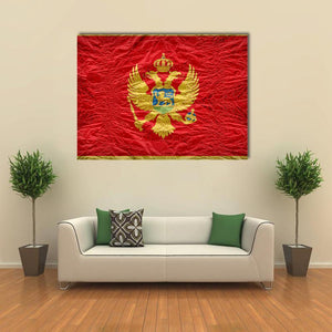 This Montenegro flag canvas centers on the coat of arms with a double-headed eagle, crown, shield, scepter and orb rendered in rich red, gold and touches of blue. The symmetrical, vintage composition creates a regal, historical mood. It suits home settings and modern interiors, such as a living room or study, where a formal, historical accent is desired.