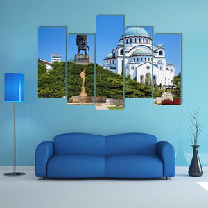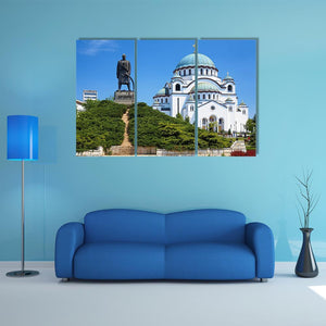 This canvas art features the majestic Temple of Saint Sava, capturing the serene beauty of its grand architecture among tree-lined surroundings. With its harmonious blend of white, blue, and green hues, it adds a touch of history to your decor.