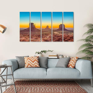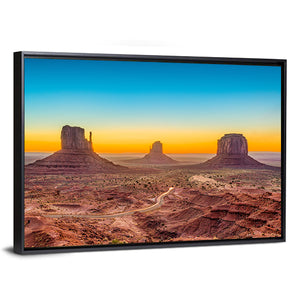 This canvas art captures the stunning beauty of Monument Valley at dawn. Featuring majestic buttes and a winding road, its vibrant sunset palette of blue, orange, and red evokes a serene yet adventurous atmosphere.
