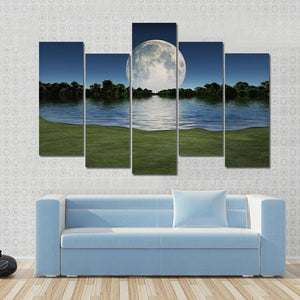 This serene canvas art captures the moon rising over a tranquil lake, surrounded by trees and grassland. The realistic details of the moon's surface and its reflection on the water evoke a peaceful and majestic atmosphere.
