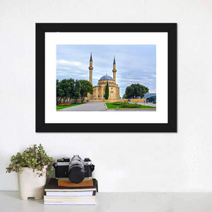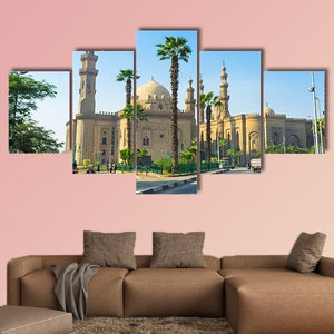 Mosque Of Sultan Hassan captured in a photorealistic cityscape, showing minarets, domes, palm trees and a street scene in tan, blue, green and white tones. The image feels peaceful and architectural. It works well in modern living rooms or entryways.