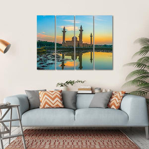 This serene canvas wall art depicts a mosque reflecting on a tranquil lake at sunset. The photorealistic style captures the beautiful symmetry of the scene, showcasing the minarets and dome surrounded by rippling water in soothing shades of blue and orange.