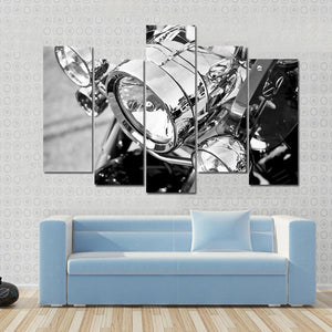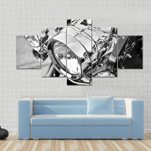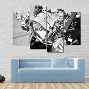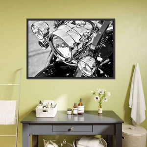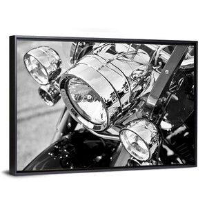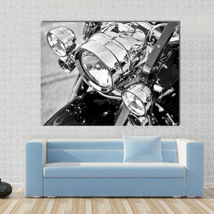 This captivating canvas features a close-up view of motorcycle lights, showcasing sleek chrome details and reflections. The powerful industrial vibe makes it an ideal addition to modern or vintage décor.