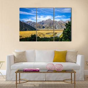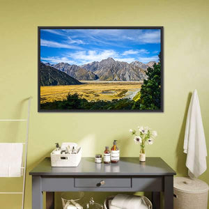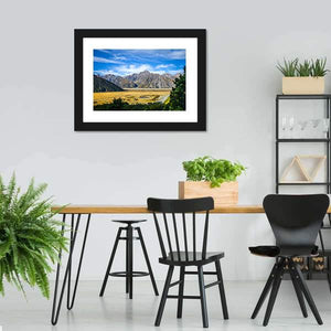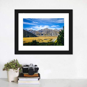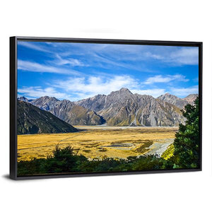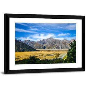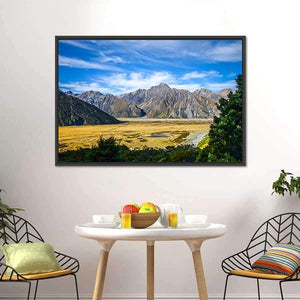 A wide-angle view of Mount Cook with mountains, valley, river and grassland rendered in a realistic, photorealistic style. The blue, green and gray palette and textured slopes with wispy clouds create a vast, serene mood that suits modern or nature-inspired rooms.
