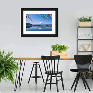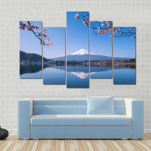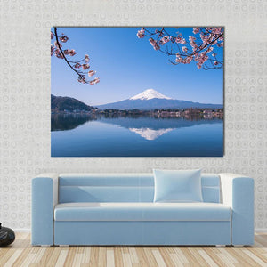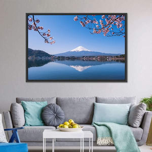 This serene canvas features the iconic Mount Fuji with blooming cherry blossoms in the foreground, capturing a picturesque landscape. The calming palette of blues, whites, and pinks makes it a beautiful addition to any nature-inspired decor.