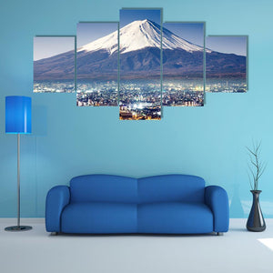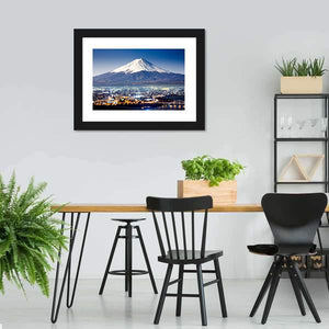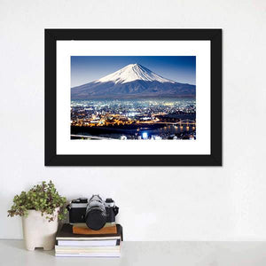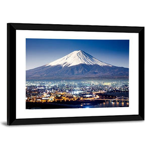 This captivating canvas features Mount Fuji, illuminated by glowing city lights under a clear night sky. The vibrant palette of blue, yellow, and orange brings a majestic and serene atmosphere to your space.