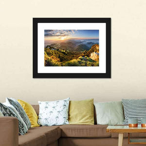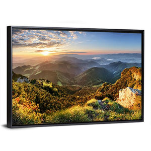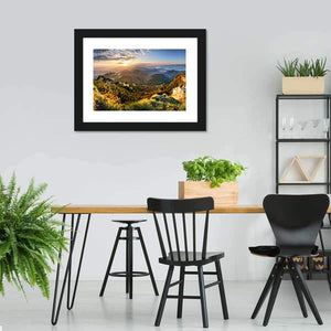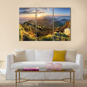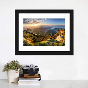 A mountain range and forest captured at sunset, with sunlight breaking through clouds and a hazy valley. Grass and foliage in the foreground create layered depth and a peaceful, golden-hour mood that suits modern, nature-inspired rooms.