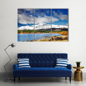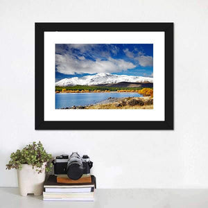 This canvas artwork features the serene beauty of Lake Tekapo, surrounded by majestic snowy mountains. The realistic portrayal captures textured clouds and a rocky shore, creating a natural atmosphere that brings a sense of calm.