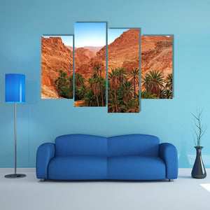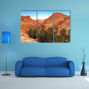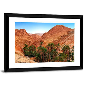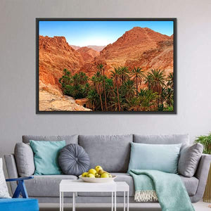 This landscape canvas art depicts a serene oasis in a desert canyon, featuring vibrant palm trees and striking rock formations. The earthy tones of orange and green evoke a tranquil, remote atmosphere, ideal for enhancing any contemporary space.