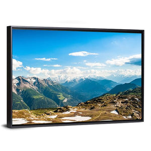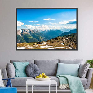 A realistic mountain panorama showing snow-patched peaks, rocky terrain, green valleys and a wide blue sky. The composition uses depth and the rule of thirds to create a serene, majestic feeling that suits modern living rooms or nature-themed rooms.