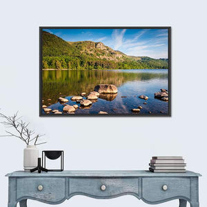 This canvas art captures the serene beauty of a tranquil lake surrounded by majestic mountains and lush trees. With its soothing blue and green tones, it's an ideal piece for nature lovers seeking to bring a peaceful ambiance to their space.