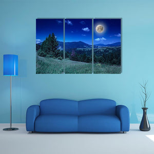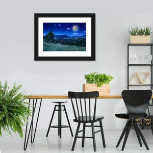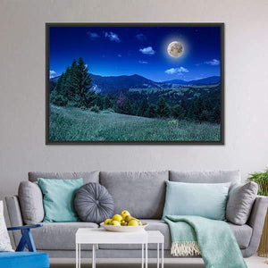 A moonlit mountain meadow with trees, a full moon, stars and clouds sets a serene, mysterious scene. The photorealistic, rustic landscape uses blue, green, white, and gray tones and a depth-focused, rule-of-thirds composition to create a calm, contemplative atmosphere. It suits modern or rustic rooms as nature-focused wall decor.