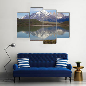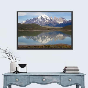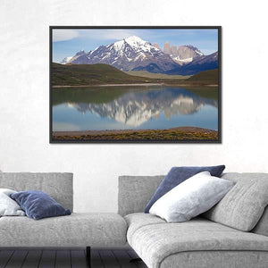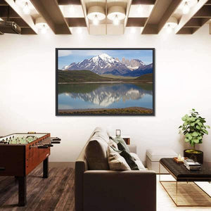 Mountains With Lake Chile features snow-capped mountains and their clear reflection on a calm lake, with rolling hills and a grassy shoreline. Rendered in a realistic style with blues, whites, greens, and browns, the scene feels serene and majestic. This landscape print suits modern room decor, such as a living room or study.