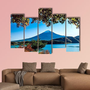 Mount Fuji appears across a clear blue sky, its snow-capped peak rising beyond a lake framed by tree branches and autumn foliage. This vibrant photographic canvas carries a calm, picturesque, natural mood through blue, green, brown, white, and yellow tones. It fits modern or nature-themed rooms such as living rooms, bedrooms, or home offices.