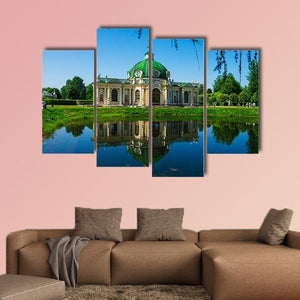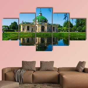Museum Kuskovo, Russia Canvas Wall Art shows a symmetrical riverside view with a pavilion, ornate green dome, trees and a calm water reflection, painted in realistic greens, blues, whites and browns. The scene has a serene, reflective mood and works well as room decor in modern interiors that favor peaceful landscape art.