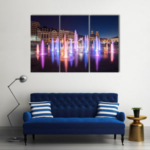This captivating cityscape features a symmetrical arrangement of colorful fountains set against a night sky. With a vibrant palette of blues, purples, pinks, and oranges, it brings a lively, magical atmosphere to any space.